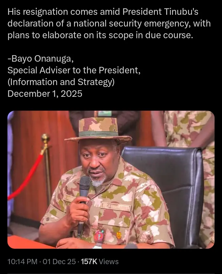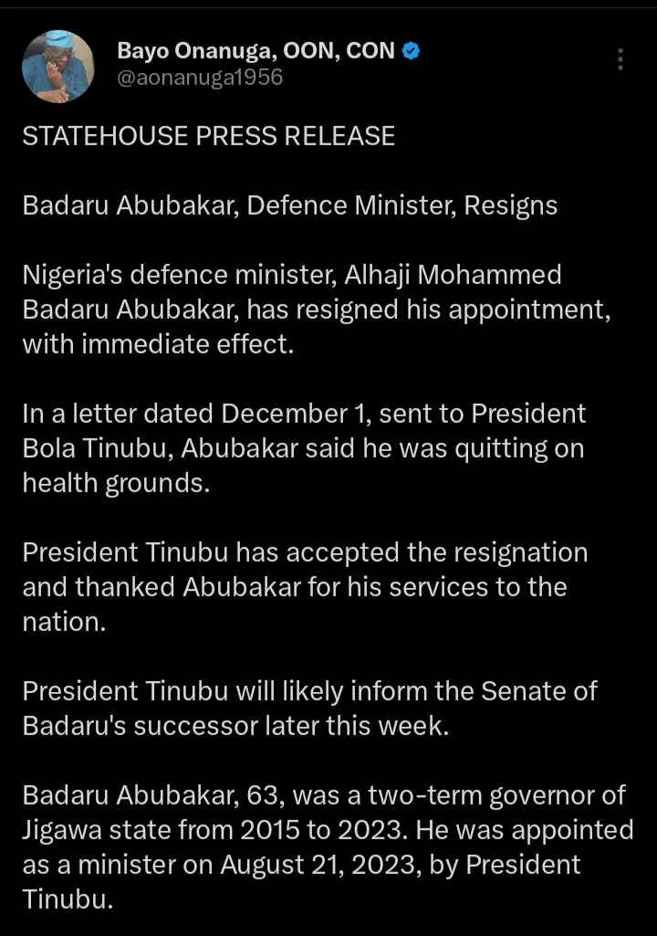 According to the statements which were shared on his official X handle, Bayo Onanuga pointed out that the the defence minister had cited health issues as the reason for his resignation. He further pointed out that his resignation came amid the president declaration of emergency on national security.