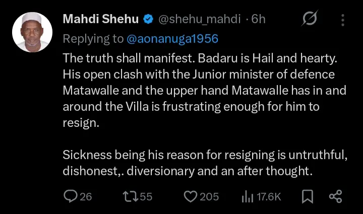 Mahdi Shehu, a security analyst and renowned political expert has taken to his official X handle to react after the special adviser on Information and Strategy, Bayo Onanuga shared the reasons why Defence Minister, Abubakar Badaru resigned from his position as Defence minister. According to the statements which were shared on his official X handle, he pointed out that there was an unsettled breach in relationship between the former defence chief and Bello Matawalle.