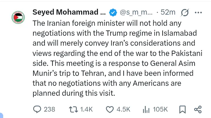 According to Marandi, Iran’s foreign minister will travel to Islamabad strictly to communicate Tehran’s perspectives on ending the ongoing conflict, rather than to pursue any form of dialogue with U.S. officials.