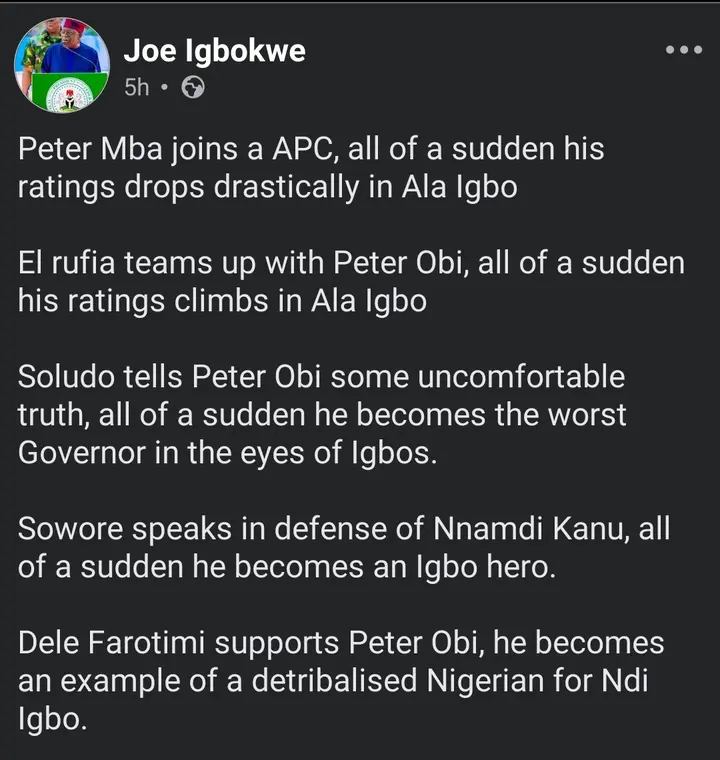 A chieftain of the All Progressives Congress (APC), Joe Igbokwe has stirred political debate on social media following a Facebook post in which he reflected on shifting political loyalties and public perception in the South-East.