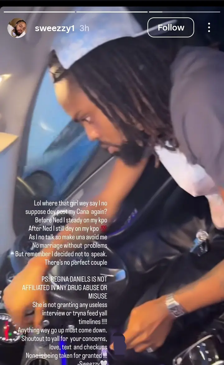 “No marriage without problems, but remember, I decided not to speak, there’s no perfect couple. Regina Daniels is not affiliated in any drug abuse or misuse. She’s not granting any useless interview or tryna feed y’all timelines, anything wey go up must come down”, Sweezzy wrote and it stirred massive reactions from the general public.