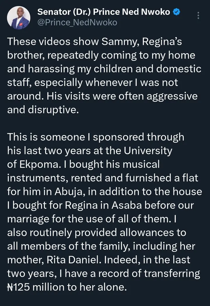 In a post shared on his official social media handle, Nwoko defended his long-standing financial support, saying his generosity toward Regina and her family predated their marriage. The senator revealed that in the past two years alone, he transferred N125 million to Regina’s mother. “This is someone I sponsored through his last two years at the University of Ekpoma. I bought his musical instruments, rented and furnished a flat for him in Abuja, in addition to the house I bought for Regina in Asaba before our marriage for the use of all of them,” Nwoko stated.