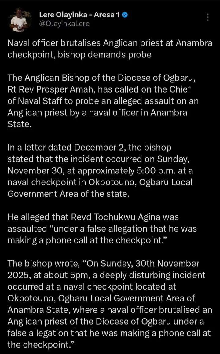 Lere Olayinka, the senior special adviser on media to the FCT minister and former governor of Rivers State, Nyesom Wike has taken to his official X handle to react after a naval officer’s involvement in a roadside altercation led to the injury of an Anglican priest in Anambra State. According to the statements which were shared on his official X handle, he pointed out that the Priest was unjustly manhandled.