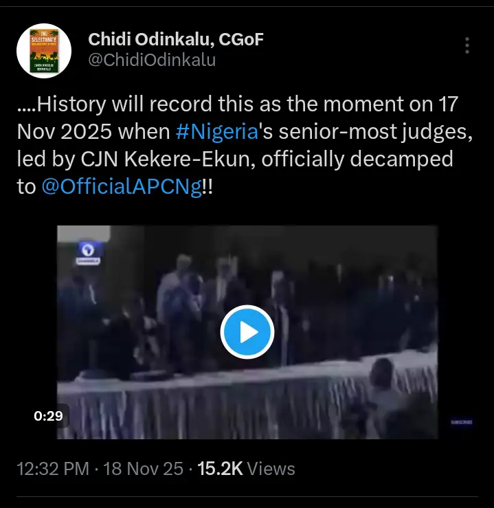“History will record this as the moment on 17 Nov 2025 when #Nigeria’s senior-most judges, led by CJN Kekere-Ekun, officially decamped to @OfficialAPCNg!!” he said.
