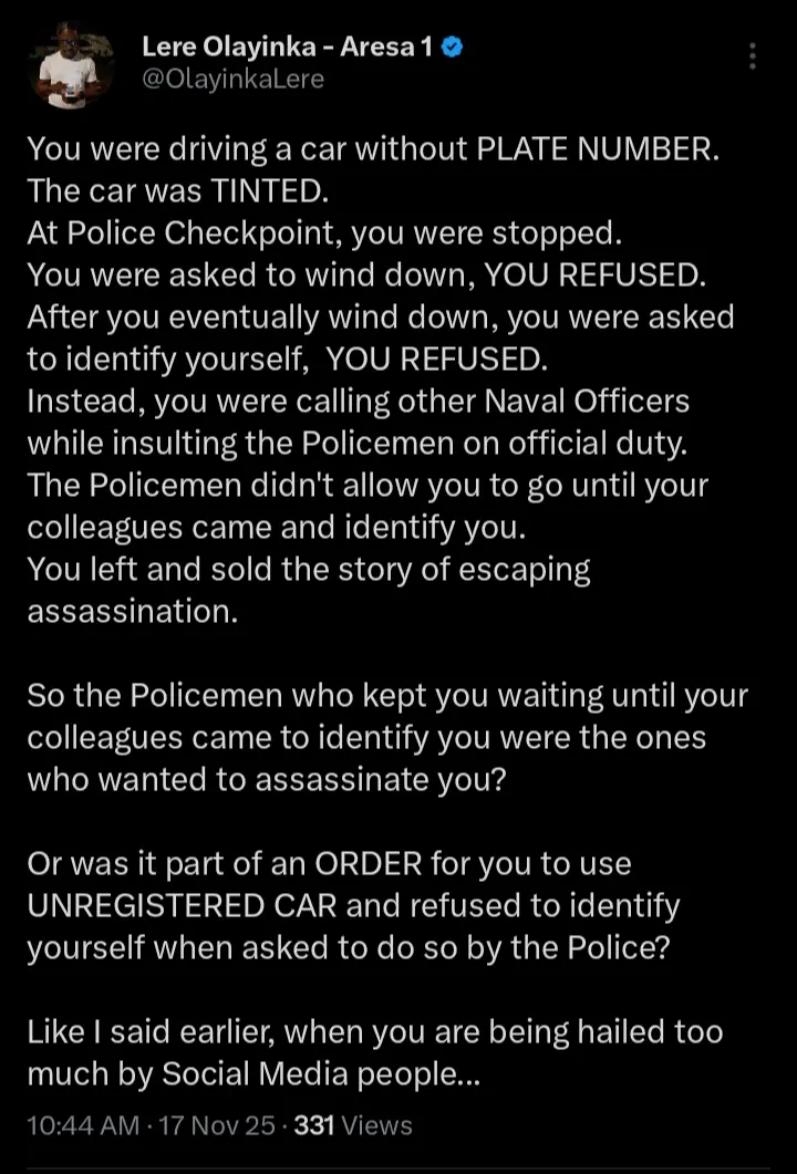 Lere Olayinka, the senior special adviser on media to the former governor of Rivers State and FCT minister, Nyesom Wike has taken to his official X handle to voice out his displeasure over the antics of AM Yerima. According to the statements which were shared on his official X handle, he pointed out that the young soldier refused to identify himself after he encountered police officers.