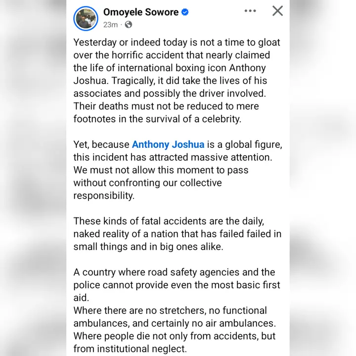 The former presidential candidate of the African Action Congress, Omoyele Sowore stated on his verified Facebook page on Tuesday; “Yesterday or indeed today is not a time to gloat over the horrific accident that nearly claimed the life of international boxing icon Anthony Joshua.”