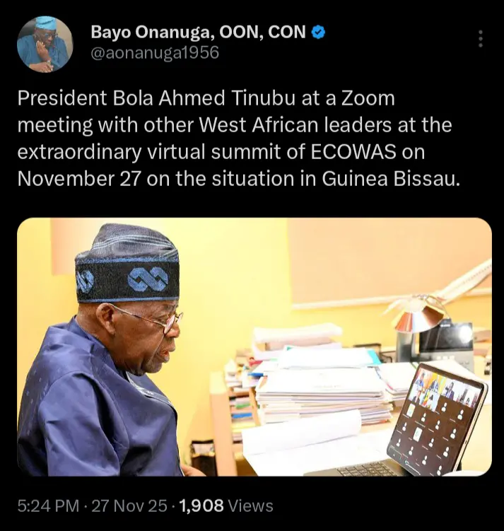 Bayo Onanuga, the senior special adviser on Information and Strategy has taken to his official X handle to react after President Tinubu was captured in virtual meeting with ECOWAS leaders over the recent military takeover in Guinea Bissau. According to the statements which were shared on his official X handle, he disclosed that the ECOWAS leaders deliberated on the ongoing situation in Guinea Bissau.