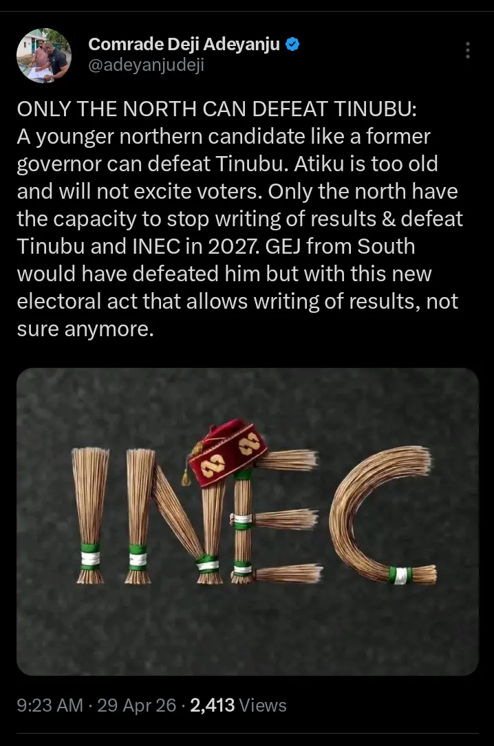 In his post, Adeyanju argued that the North remains the most decisive political force in determining the outcome of the next presidential election and suggested that only a candidate from the region has the strength and structure to mount a serious challenge against the current administration.