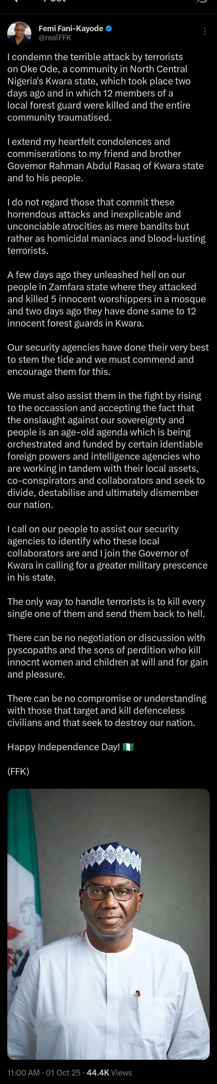 In a recent statement via his official X account, former Aviation Minister Femi Fani-Kayode has called for an uncompromising response to terrorists in Nigeria while reacting to recent killing in Kwara State.
