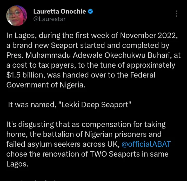According to the statements which were shared on her official X handle, she pointed out that former president Muhammadu Buhari started and completed a seaport in the same state in November 2022.