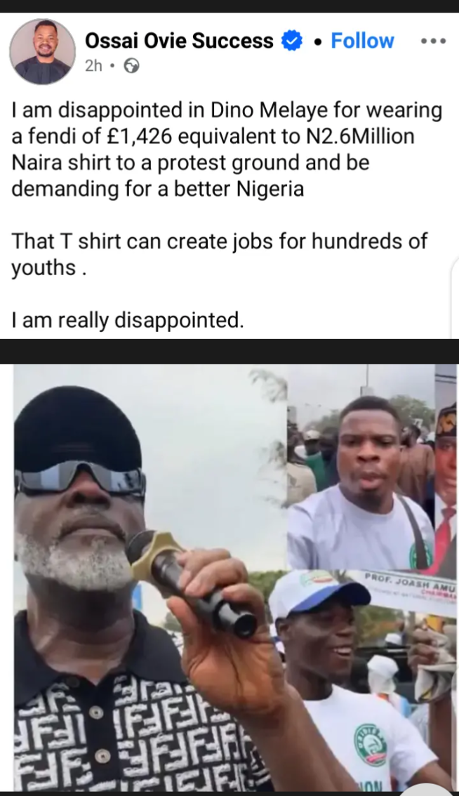 In the post that Ovie Success made on his page, he said Senator Dino Melaye should not have worn a Fendi shirt that cost N2.6 million to the protest ground. He said the money that he spent on buying the shirt can create jobs for a lot of youths in Nigeria.