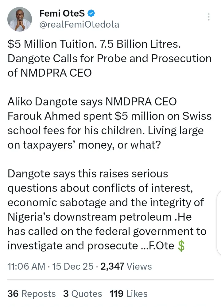 “Aliko Dangote says NMDPRA CEO Farouk Ahmed spent $5 million on Swiss school fees for his children. Living large on taxpayers’ money or what?