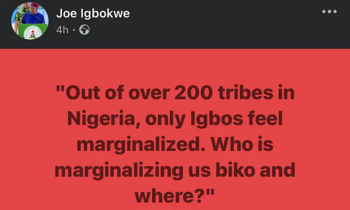 In a recent statement shared on social media, Igbokwe argued that despite Nigeria having more than 200 ethnic groups, the narrative of marginalization is most commonly associated with the Igbo people. His comments appeared to challenge that widely discussed perspective.