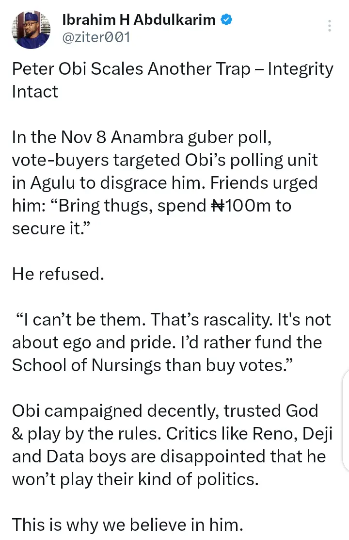 In the post that surfaced online, Ibrahim Abdulkarim stated that during the Anambra governorship election, Peter Obi refused to bring thugs to his polling unit when some people advised him to do so.