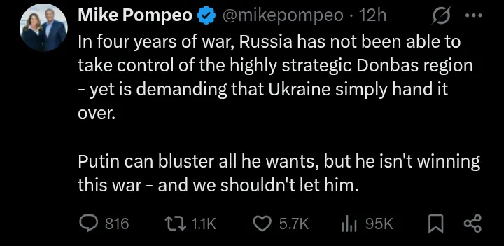 Former U.S. Secretary of State Mike Pompeo has dismissed Russia’s expectations that Ukraine should hand over the contested Donbas region, arguing that President Vladimir Putin has failed to secure the territory despite four years of full-scale war.
