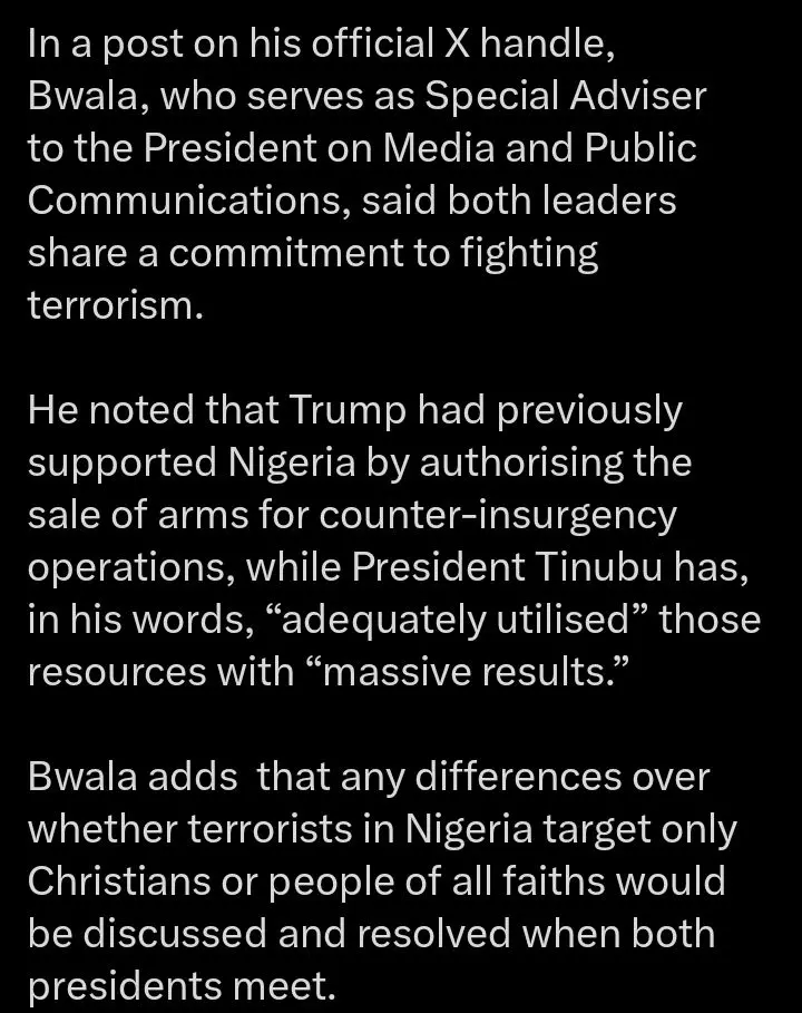 The Nigerian Presidency has confirmed that President Bola Tinubu will engage in high-level discussions with United States President Donald Trump in the coming days.
