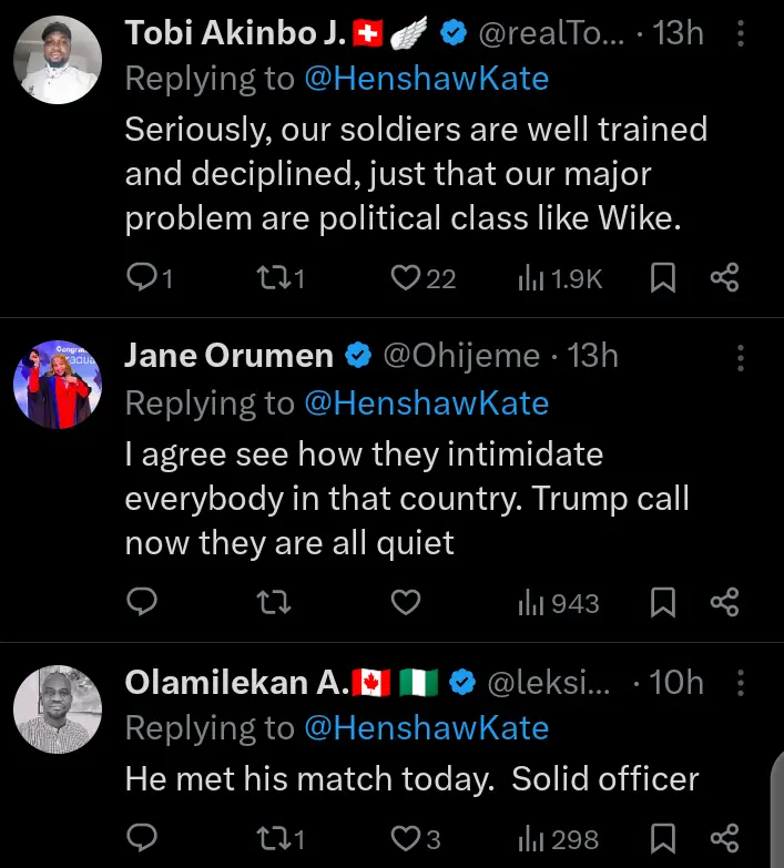 Social media users have taken to their official X account on November 11 to react to the statement that was made by Nollywood actress, Kate Henshaw after a young military officer, Lieutenant A. M Yerima stopped the FCT Minister, Nyesom Wike from accessing a land.
