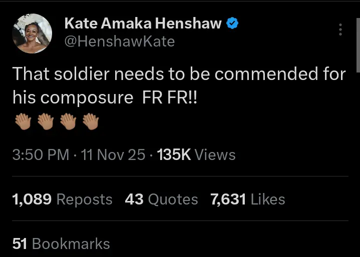 Reacting, Kate Henshaw commended the soldier for composing himself properly.