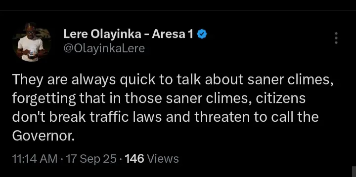 Citizens don’t break traffic laws and threaten to call the governor.” Lere Olayinka wrote.