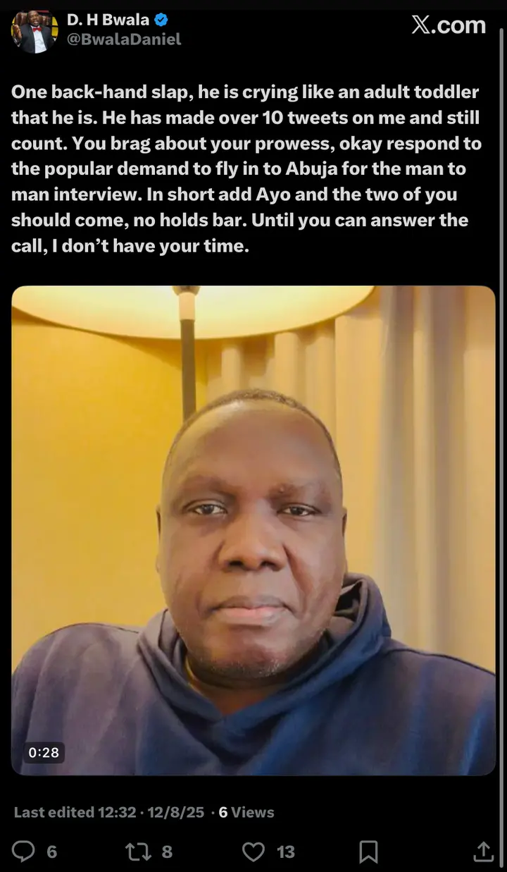 The latest message follows a series of heated exchanges between both men that have dominated online discussions. In the video, Bwala delivered a sharp rebuke, accusing Rufai of repeatedly reacting to his earlier comments. “One backhand slab is crying like a toddler that he is and has made over 10 tweets on me and still counting,” he said, referencing the broadcaster’s responses on social media.
