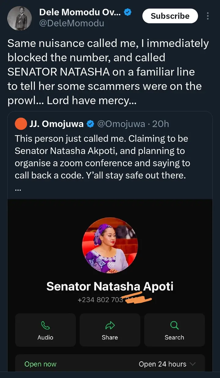“Same nuisance called me, I immediately blocked the number, and called SENATOR NATASHA on a familiar line to tell her some scammers were on the prowl. Lord have mercy,” Momodu wrote, warning others about the ongoing scheme.