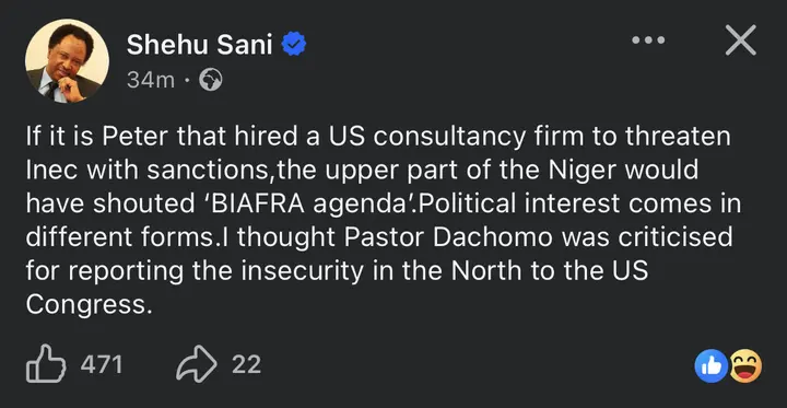 Former Nigerian senator Shehu Sani has sparked fresh debate on political bias and regional sentiments in the country following his reaction to recent claims involving the hiring of a United States consultancy firm to pressure the Independent National Electoral Commission (INEC) with possible sanctions.