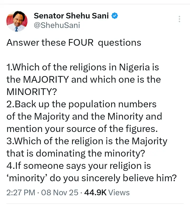 Sani’s questions appear to challenge the growing tension and misconceptions around religious dominance in national discourse, particularly amid debates over representation, governance, and social equity. Analysts believe the former senator’s post aims to encourage Nigerians to question politically motivated narratives that pit one faith against another.