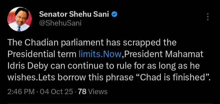 Senator Shehu Sani, a renowned human rights activist and former federal lawmaker has taken to his official X handle to react after the Chadian parliament scrapped term limits for the president. According to his statements which drew widespread attention from the general public, he asked if Chad was finished.