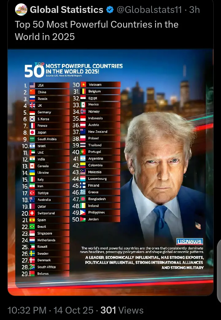 According to the report that was shared by Global Statistics, the United State of America is the most powerful country in 2025. Other on the list include, China, Russia, United Kingdom, Germany, South Korea, France, Japan, Saudi Arabia, Israel, United Arab Emirates, India and many others.