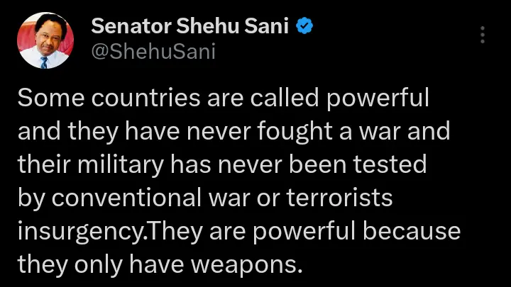 Reacting, Senator Shehu Sani stated that some countries have never fought a war but they are called powerful because they have weapons.