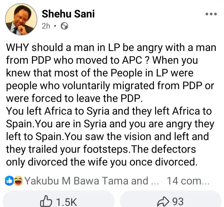 Sani wrote, ‘WHY should a man in LP be angry with a man from PDP who moved to APC ? When you knew that most of the People in LP were people who voluntarily migrated from PDP or were forced to leave the PDP. You left Africa to Syria and they left Africa to Spain. You are in Syria and you are angry they left to Spain.You saw the vision and left and they trailed your footsteps.The defectors only divorced the wife you once divorced.”