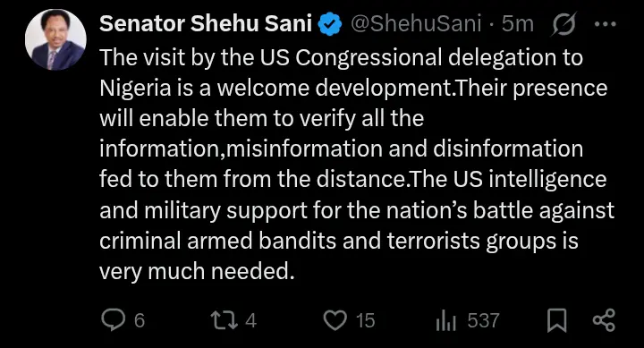 Former Kaduna Central Senator, Shehu Sani, has hailed the visit of a United States Congressional delegation to Nigeria, describing it as a timely and important step toward strengthening collaboration in the fight against insecurity.