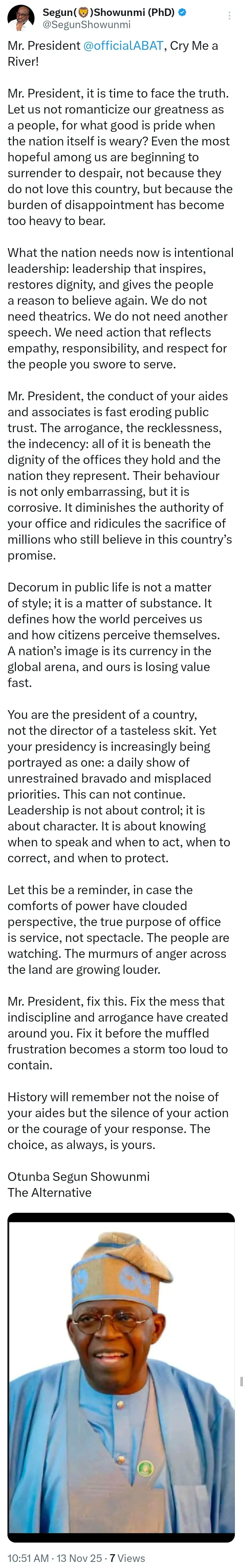 Otunba Segun Showunmi has written a strong message to President Bola Ahmed Tinubu, calling on him to take charge and restore discipline within his government. In his post on X, Showunmi said that many Nigerians are losing hope, not because they hate the country, but because they are tired of disappointment and poor leadership.