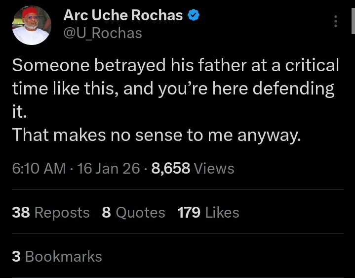 One of the chieftains of the African Democratic Congress, ADC, Uche Rochas has taken to his official X account on Friday, January 16, 2026 to describe Abba Atiku Abubakar, the son of the former Vice President of Nigeria, Alhaji Waziri Atiku Abubakar as a betrayal.