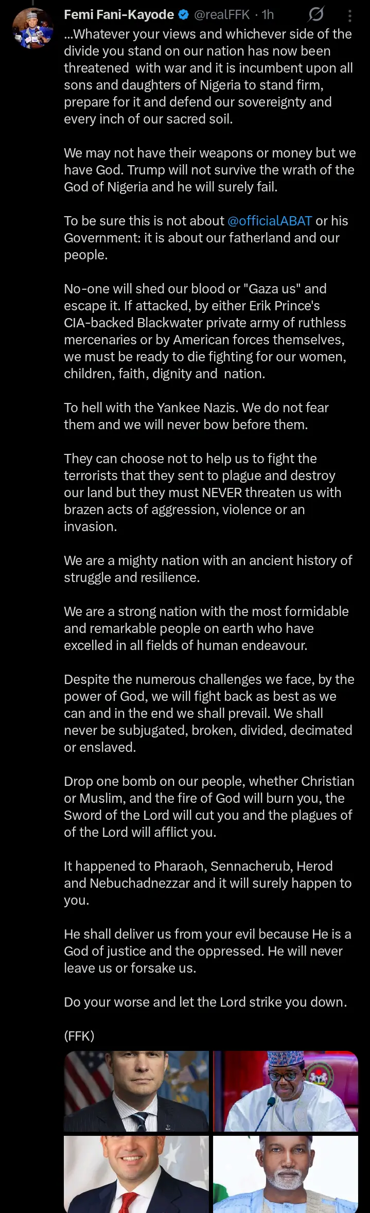 “Whatever your views and whichever side of the divide you stand on our nation has now been threatened with war and it is incumbent upon all sons and daughters of Nigeria to stand firm, prepare for it and defend our sovereignty and every inch of our sacred soil. We may not have their weapons or money but we have God. Trump will not survive the wrath of the God of Nigeria and he will surely fail.