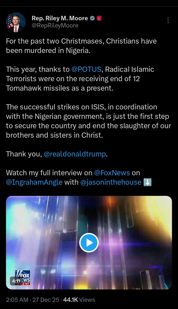 However, Congressman Riley Moore, a United States lawmaker in a recent statement which was shared on his official X handle, described the airstrikes as not only precise, but a Christmas gift to the terrorists by president Donald Trump.