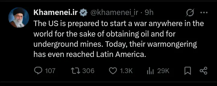 He further claimed that Washington’s “warmongering” has now expanded beyond traditional theatres of conflict and is “even reaching Latin America.” Although he did not mention specific countries, the remark comes amid rising tensions between the US and several Latin American governments over political crises, sanctions, and ideological disagreements. Tehran has historically sided with governments in the region that oppose US influence, framing them as victims of external interference.