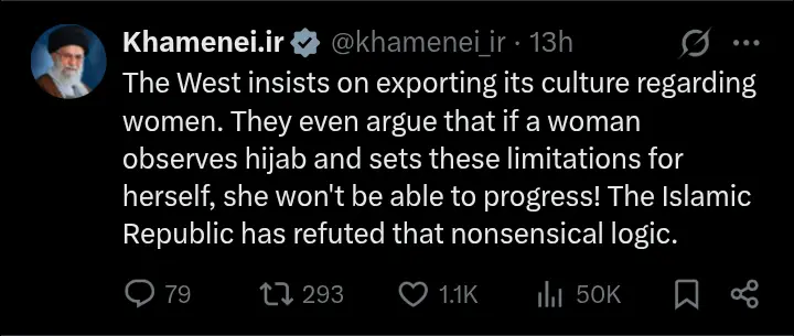 “The West insists on exporting its culture regarding women,” he wrote. “They even argue that if a woman observes hijab and sets these limitations for herself, she won’t be able to progress. The Islamic Republic has refuted that nonsensical logic.”