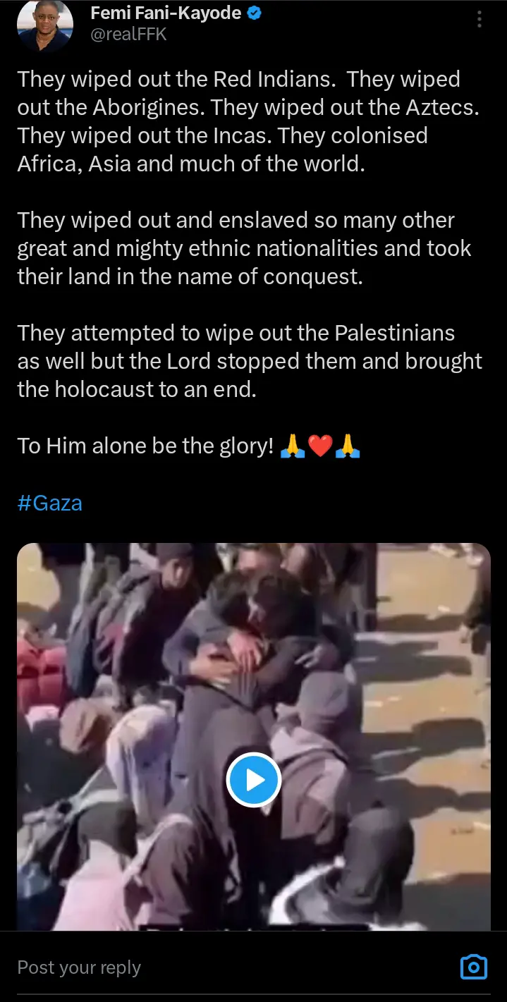‎Fani-Kayode linked the suffering of Palestinians to past atrocities committed against Native Americans, Australian Aborigines, the Aztecs, the Incas, and many African and Asian communities.