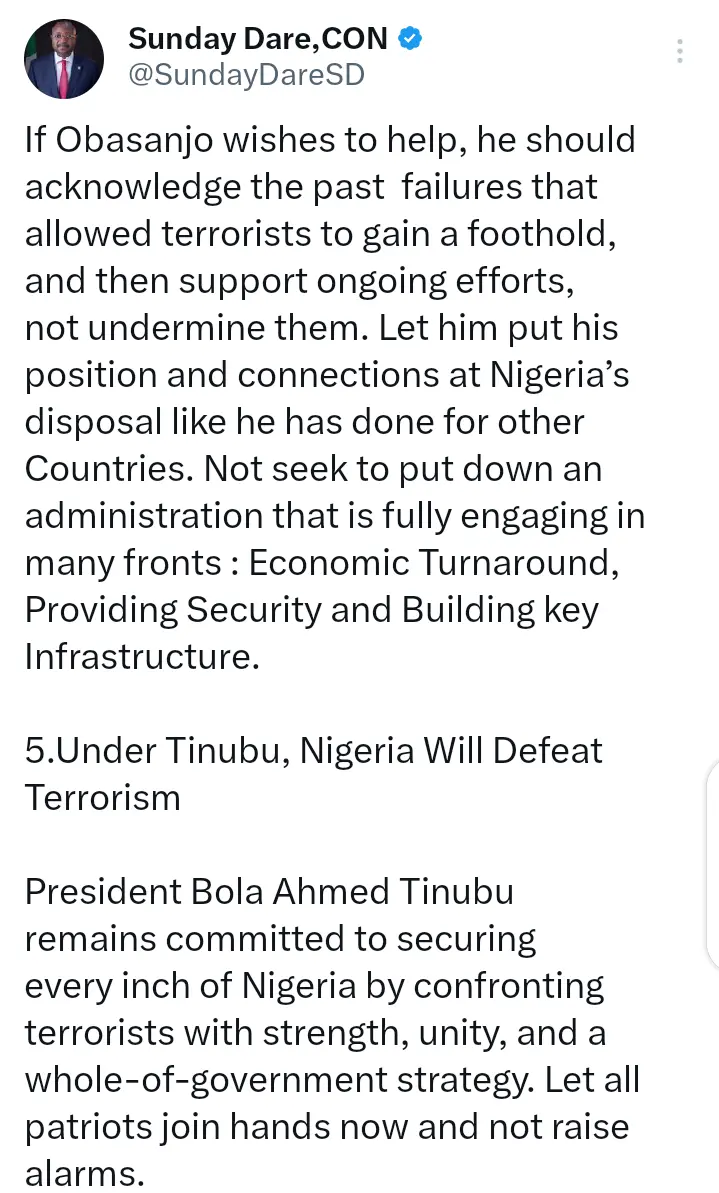 Sunday Dare, the Special Adviser to President Bola Ahmed Tinubu on Public Communication has reacted to the statement that was made by former President of Nigeria, Olusegun Obasanjo about security in Nigeria.