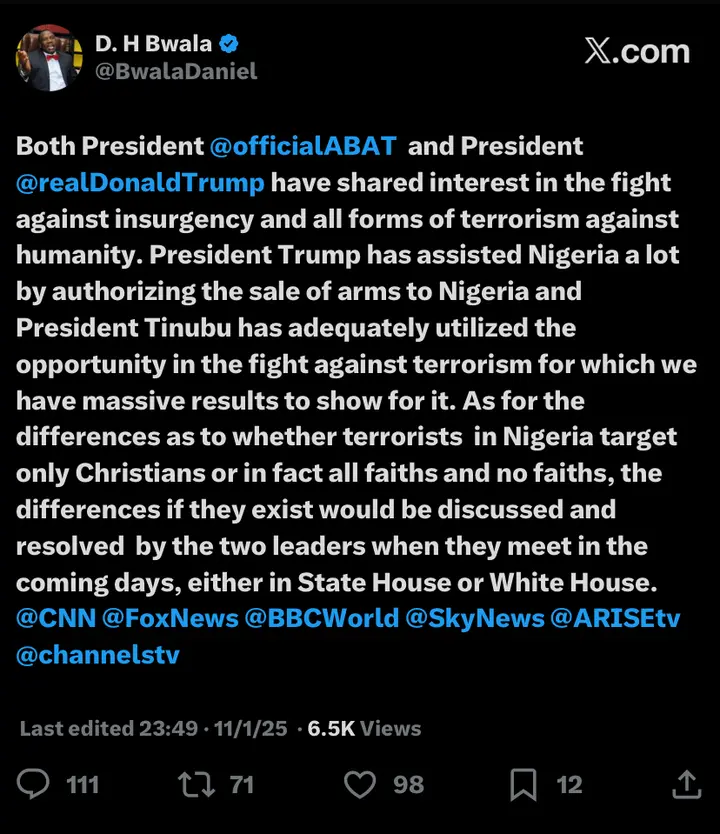In a post shared on his official X handle on Saturday, November 1, 2025, Bwala noted that both leaders have demonstrated a strong interest in combating all forms of terrorism threatening humanity. He commended Trump for his past support to Nigeria, particularly in authorizing the sale of arms to aid the country’s counterterrorism operations.