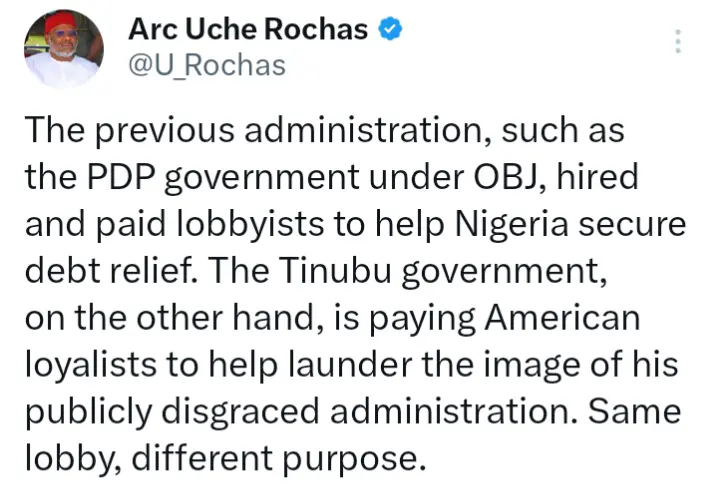 In a post shared on his verified X account, Rochas said that under President Olusegun Obasanjo, the PDP government hired lobbyists to help Nigeria obtain debt relief.