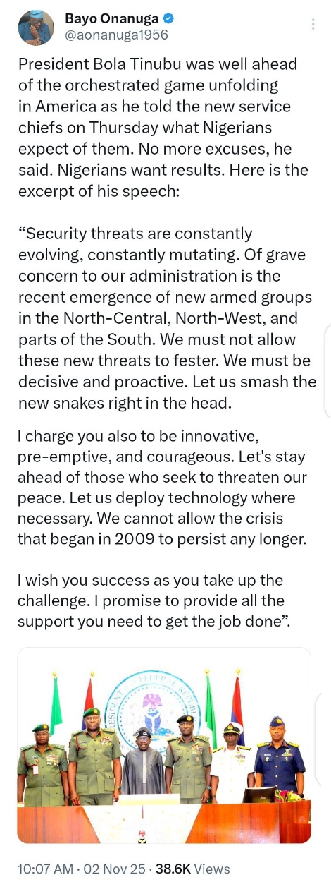 The reaction of President Bola Ahmed Tinubu was contained in the post that the Special Adviser to the President on Information and Strategy, Bayo Onanuga shared on his official X handle on Sunday, November 2, 2025.