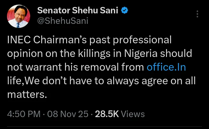 One of the chieftains of the All Progressive Congress, APC, and former Kaduna lawmaker, Senator Shehu Sani has taken to his official X account on November 8, 2025 to react after he heard that the newly appointed Chairman of the Independent National Electoral Commission, INEC, Professor Joash Amupitan wrote a legal brief confirming genocidal killings in Nigeria.