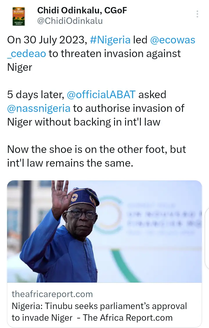 “In July 2023, Nigeria led ECOWAS to threaten invasion against Niger. 5 days later, President Bola Ahmed Tinubu asked National Assembly to authorize the invasion of Niger Republic without backing of international law”. View, More,