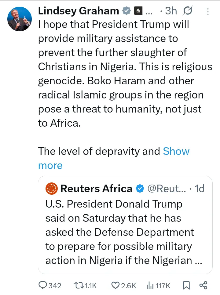 According to a post made by the Republican United States of America Senator, Senator Lindsey Graham Via his official X account, the American Senator, explicitly labeled the systematic attacks on Christian communities as genocide, identifying the primary perpetrators as Boko Haram and other radical Islamic groups, whom he accused of posing a threat to humanity, not just to Africa.