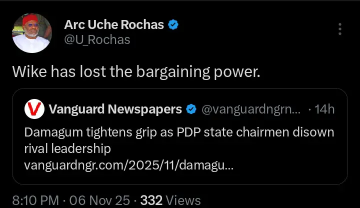 PDP chieftain Arch Uche Rochas on Friday, November 7, 2025, reacted to new developments within the Peoples Democratic Party (PDP), stating that former Governor Nyesom Wike has “lost the bargaining power.”