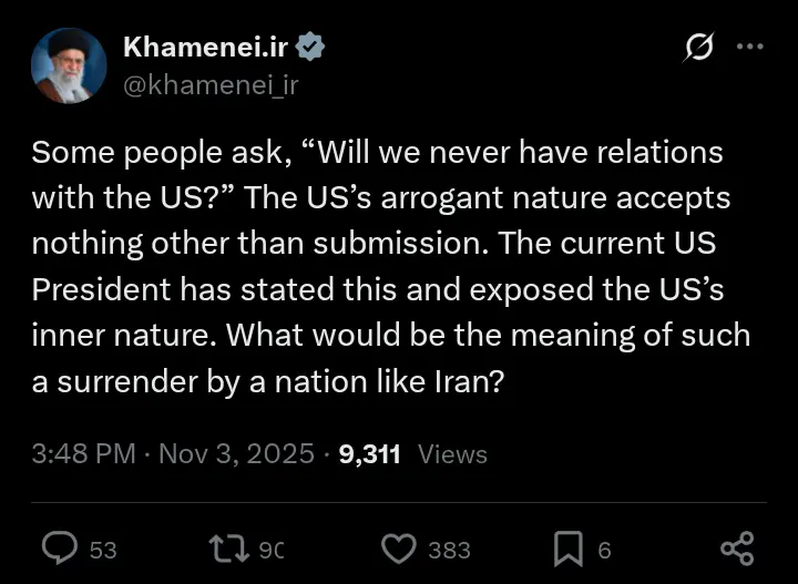 In a post shared on his verified Twitter account, Khamenei said some people often question whether Iran will ever re-establish ties with the United States, but he stressed that such relations would amount to surrendering Iran’s independence and dignity.