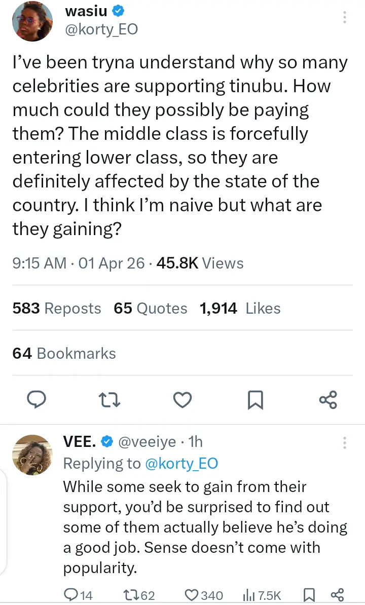 Her statement is coming after Korty EO asked what the celebrities are gaining for supporting President Bola Ahmed Tinubu.