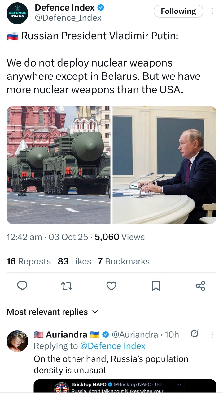 According to the Defence Index report on Friday October 3, 2025, President Vladimir Putin has stated that Russia refrains from deploying nuclear weapons abroad except in Belarus, attributing this restraint to its substantial arsenal exceeding that of the United States. This remark, made in a recent interview on October 3, 2025, underscores Moscow’s strategic confidence and aversion to escalation beyond current alliances.